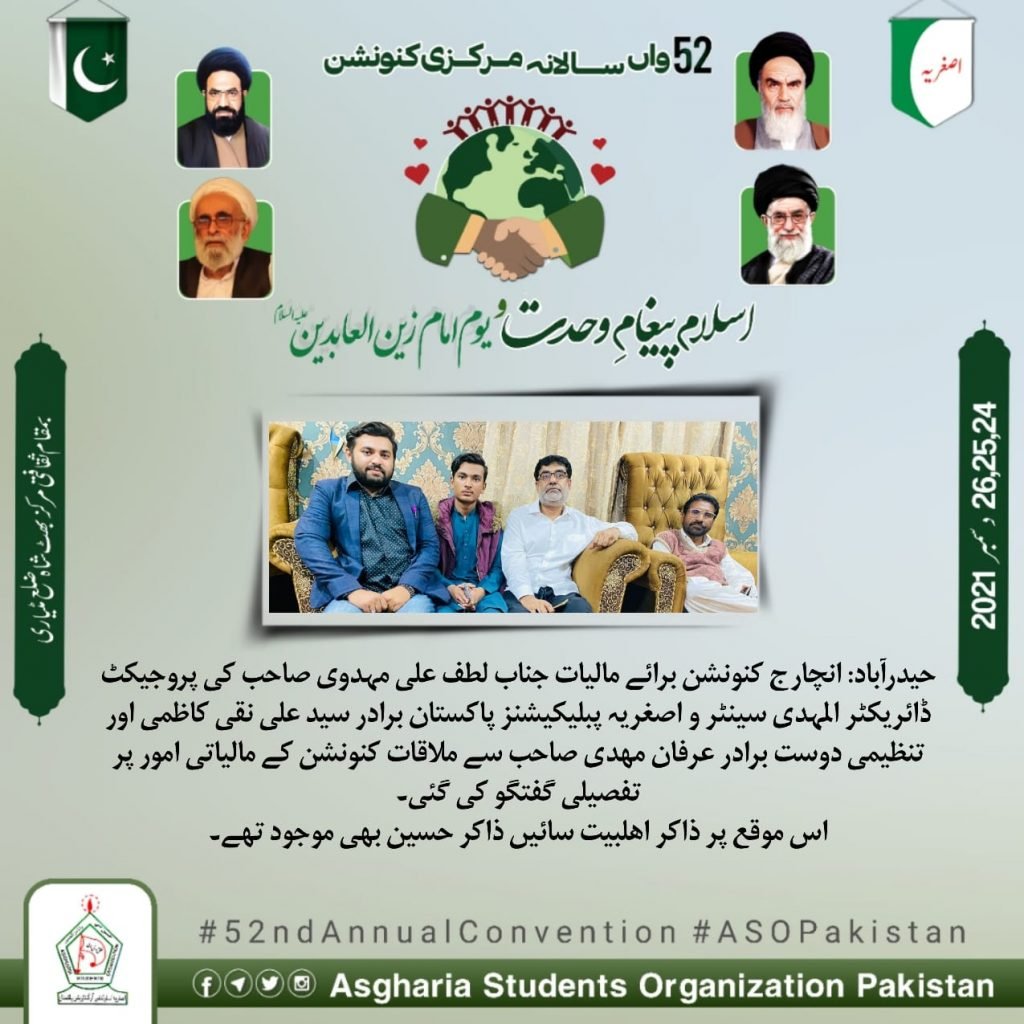 حیدرآباد: انچارج کنونشن برائے مالیات جناب لطف علی مہدوی صاحب کی پروجیکٹ ڈائریکٹر المہدی سینٹر و اصغریہ پبلیکیشنز پاکستان برادر سید علی نقی کاظمی اور تنظیمی دوست برادر عرفان مھدی صاحب سے ملاقات کنونشن کے مالیاتی امور پر تفصیلی گفتگو کی گئی۔