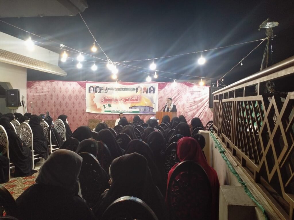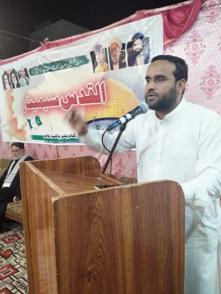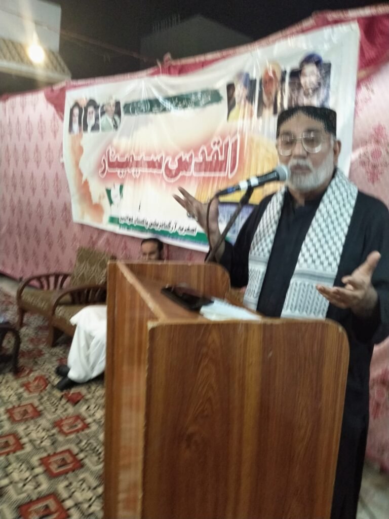 القدس سیمینار میں ۔۔۔دانشور معظم محترم برادر اخلاق احمد اخلاق صاحب اور پروفيسر فضل اصغري خطاب کرتے ہوئے