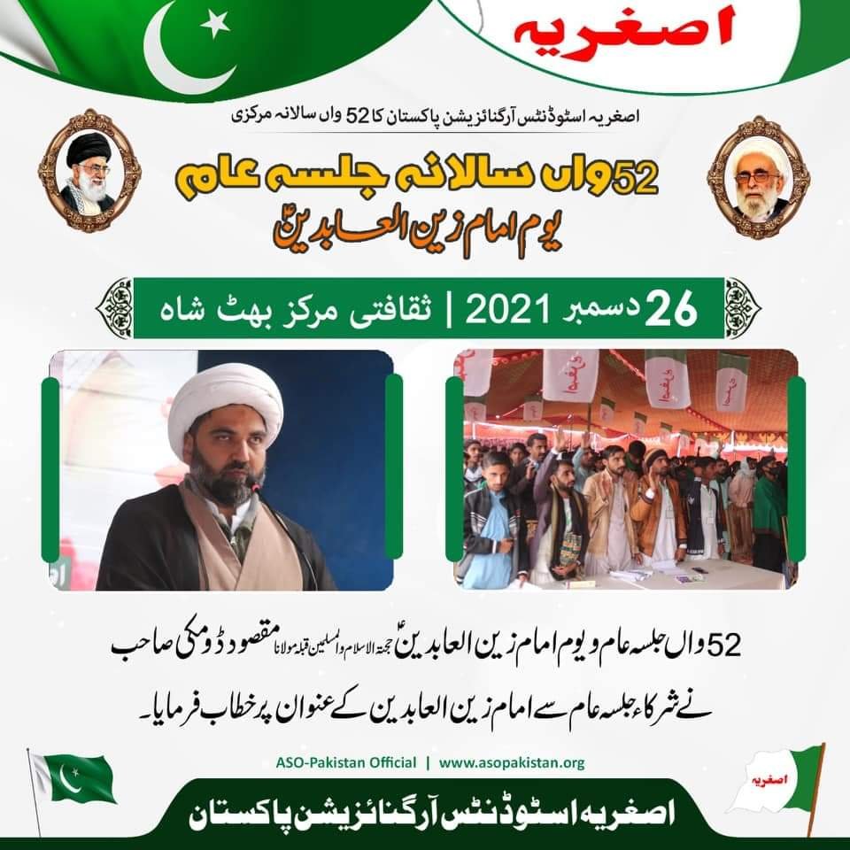 اصغری طلباء کا 52واں جلسہ عام ویوم امام زین العابدین ؑ حجتہ الاسلام والمسلمین قبلہ مولانا سید مختار رضوی صاحب حجتہ الاسلام والمسلمین قبلہ سید اسد اقبال زیدی صاحب صوبائی صدرسندھ شیعہ علماء کونسل پاکستان۔ حجتہ الاسلام والمسلمین قبلہ مولانا میر مقصود علی ڈومکی صاحب مرکزی ترجمان مجلسِ وحدتِ مسلمین و رکنِ سرپرست کاٶنسل اے ایس او پاکستان نےشرکاء جلسہ عام سے امام زین العابدین کے عنوان پرخطاب فرمایا۔